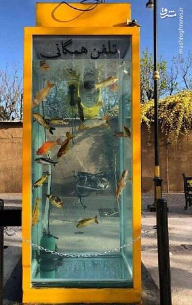 باجه تلفن عمومی از کار افتاده، به آکواریوم ماهیهای قرمز تبدیل شده است.