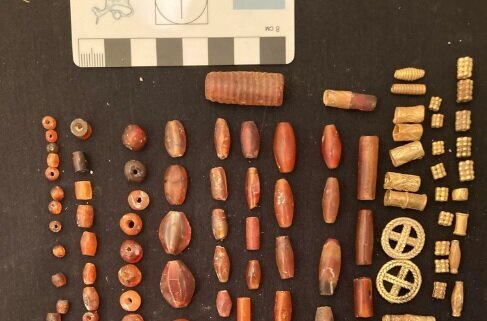 کاوشگران علاوهبر این زوج، آثار تاریخی ارزشمندی، از جمله صدها مُهره و آویزهای طلا و عقیق تشکیلدهنده سه گردنبند را به همراه ظروف سرامیکی متعلق به سرزمینهای مرزی سوریه و بینالنهرین و بقایای یک تخت چوبی را نیز کشف کردهاند.